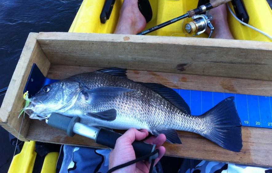 Fly fisherman in kayaks also take good numbers of drum using chartreuse or black Clouser Minnow
