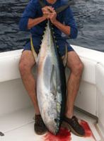 Big "bite me" trolling lures trolled around 10 to 14 knots and the Williamson "coyote" trolled slower at around 7 to 10 knots both work really well and will generally get you the most bites. To find the schools, look for the birds and then get in front of the school so you don't run over them and put the school down. The average yellowfin right now is running about 40 pounds, but there are plenty of fish in the 60 pound plus category out there Till Next Month, Good Fishing & Tight Lines To You All! | ||||||||