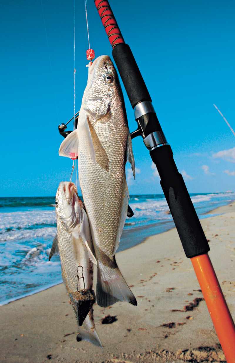 Small pieces of shrimp, sand fleas and cut clams are the baits of choice for most surf fishermen who use long surf rods with two or three dropper rigs and 2 oz. to 6 oz. pyramid sinkers.