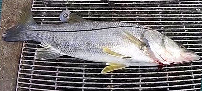 A 5" assassin soft plastic jerk bait in the pilchard color or a top water chugging plug with a black top has been working really well to get these snook to bite.