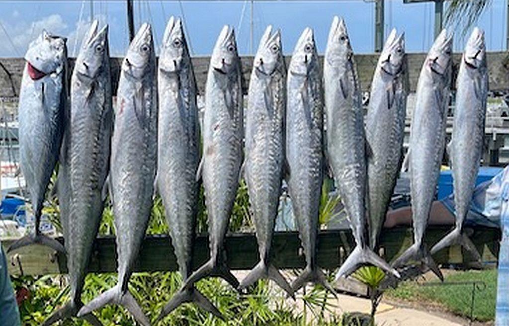 By noon, depending on the tides, blue water and fewer weeds appear in 90 to 115 ft of water. This is your best bet for dolphin and kingfish.