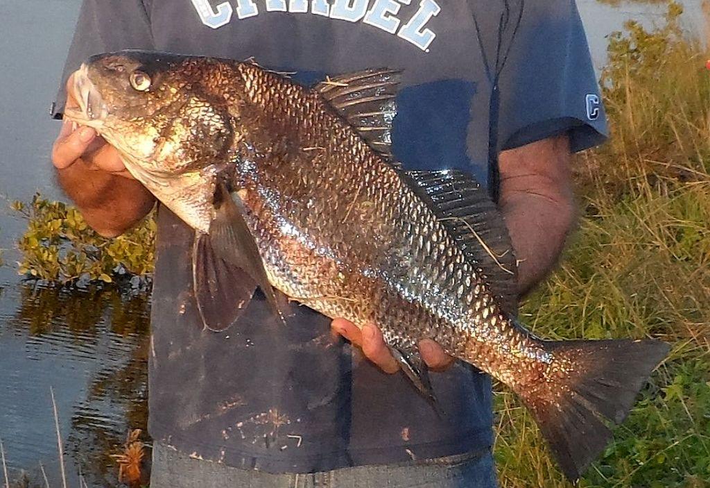 days you can occasionally see them tailing on the shallow mud flats along East Gator Creek Road. Live or dead shrimp, sand fleas, and fiddler crabs are good baits for black drum in this area. On Tuesday afternoon, just about all of the best fishing spots were taken by bank fishermen after black drum.